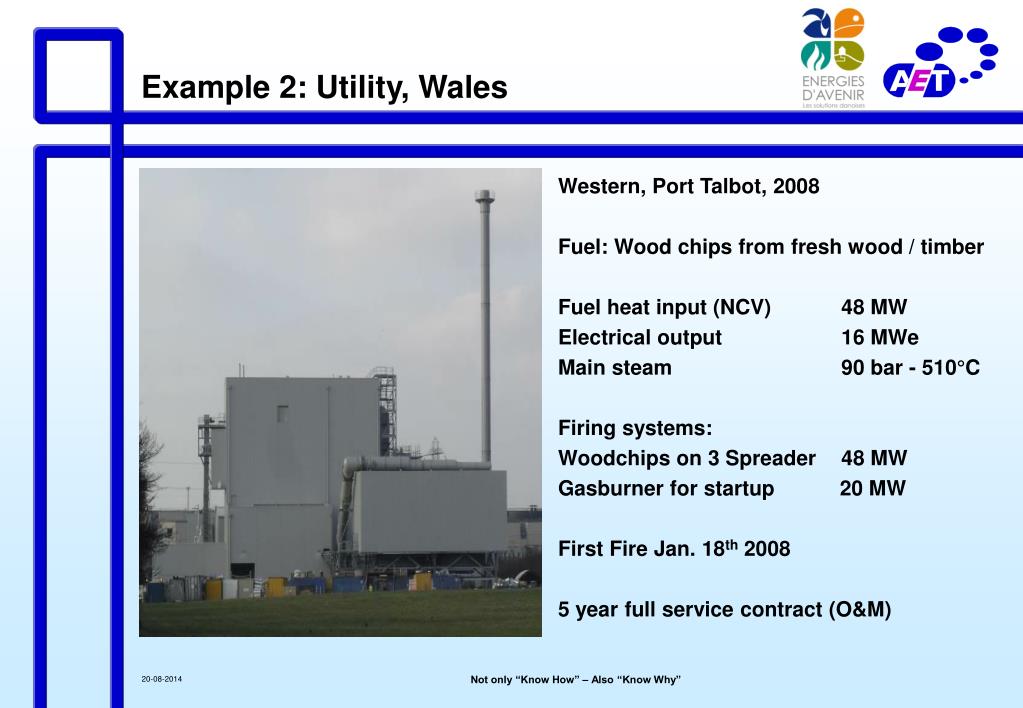 Example 2: Utility, Wales • Western, Port Talbot, 2008 • Fuel: Wood chips from fresh wood / timber • Fuel heat input (NCV) 48 MW • Electrical output 16 MWe • Main steam 90 bar - 510°C • Firing systems: • Woodchips on 3 Spreader 48 MW • Gasburner for startup 20 MW • First Fire Jan. 18th 2008 • 5 year full service contract (O&M) Not only “Know How” – Also “Know Why”