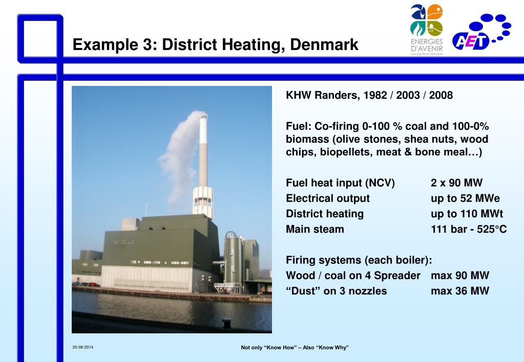Example 3: District Heating, Denmark • KHW Randers, 1982 / 2003 / 2008 • Fuel: Co-firing 0-100 % coal and 100-0% biomass (olive stones, shea nuts, wood chips, biopellets, meat & bone meal…) • Fuel heat input (NCV) 2 x 90 MW • Electrical output up to 52 MWe • District heating up to 110 MWt • Main steam 111 bar - 525°C • Firing systems (each boiler): • Wood / coal on 4 Spreader max 90 MW • “Dust” on 3 nozzles max 36 MW Not only “Know How” – Also “Know Why”