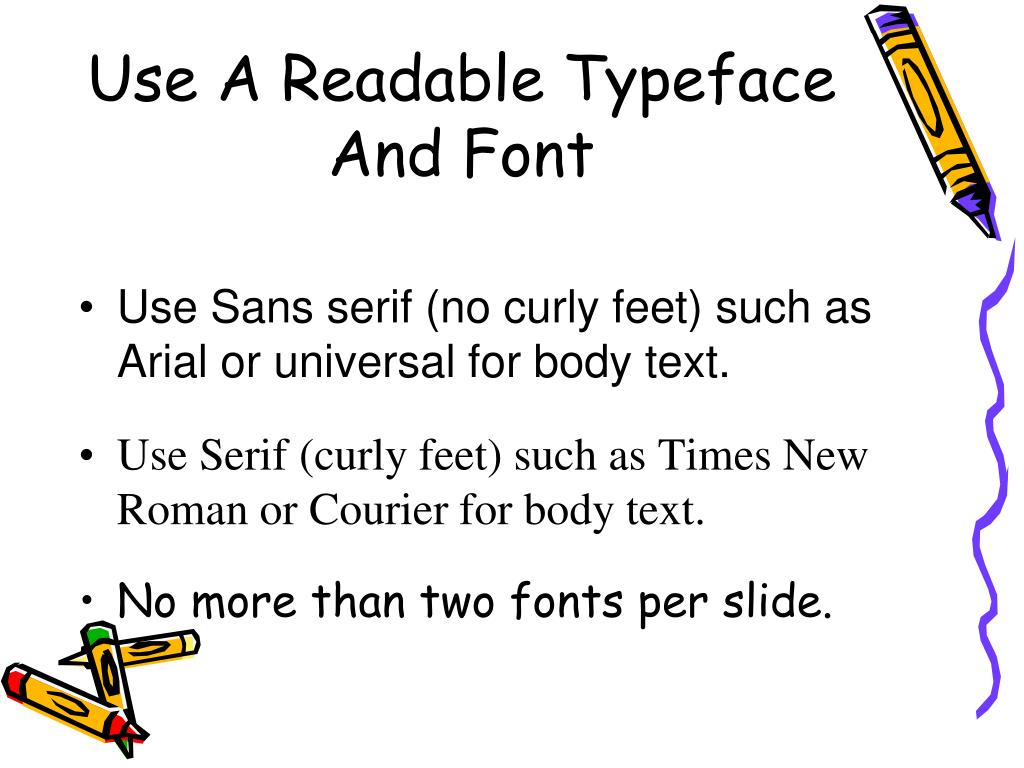 Use A Readable Typeface And Font • Use Sans serif (no curly feet) such as Arial or universal for body text. • Use Serif (curly feet) such as Times New Roman or Courier for body text. • No more than two fonts per slide.