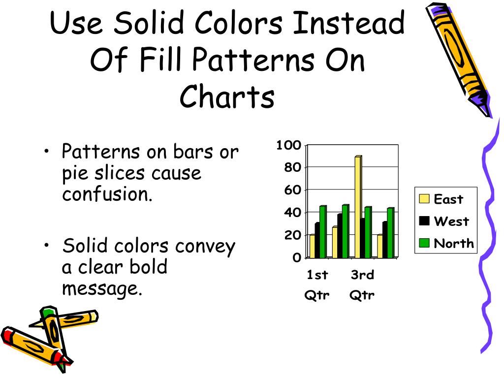 Use Solid Colors Instead Of Fill Patterns On Charts • Patterns on bars or pie slices cause confusion. • Solid colors convey a clear bold message.