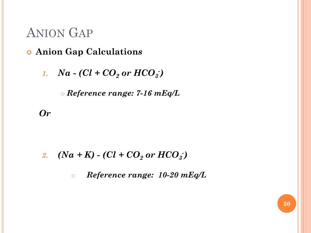 Anion Gap • Anion Gap Calculations • Na - (Cl + CO2 or HCO3-) • Reference range: 7-16 mEq/L Or • (Na + K) - (Cl + CO2 or HCO3-) • Reference range: 10-20 mEq/L