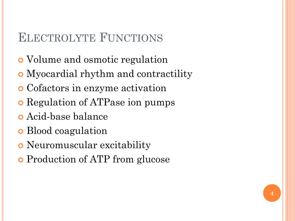 Electrolyte Functions • Volume and osmotic regulation • Myocardial rhythm and contractility • Cofactors in enzyme activation • Regulation of ATPase ion pumps • Acid-base balance • Blood coagulation • Neuromuscular excitability • Production of ATP from glucose
