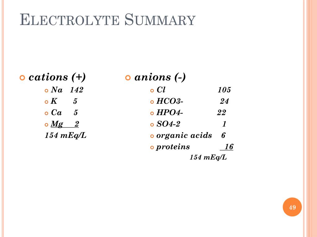 Electrolyte Summary • cations (+) • Na 142 • K 5 • Ca 5 • Mg 2 154 mEq/L • anions (-) • Cl 105 • HCO3- 24 • HPO4- 22 • SO4-2 1 • organic acids 6 • proteins 16 154mEq/L