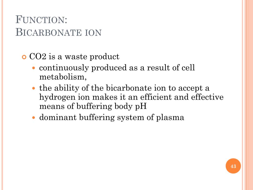 Function:Bicarbonate ion • CO2 is a waste product • continuously produced as a result of cell metabolism, • the ability of the bicarbonate ion to accept a hydrogen ion makes it an efficient and effective means of buffering body pH • dominant buffering system of plasma