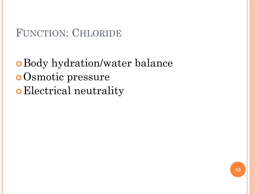 Function: Chloride • Body hydration/water balance • Osmotic pressure • Electrical neutrality