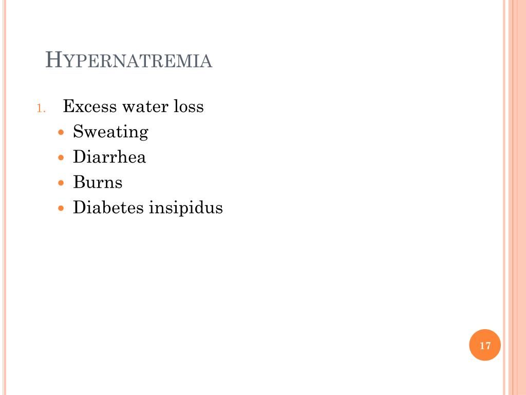 Hypernatremia • Excess water loss • Sweating • Diarrhea • Burns • Diabetes insipidus