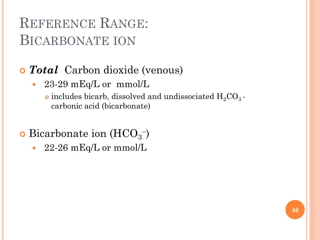 Reference Range:Bicarbonate ion • Total Carbon dioxide (venous) • 23-29 mEq/L or mmol/L • includes bicarb, dissolved and undissociated H2CO3 - carbonic acid (bicarbonate) • Bicarbonate ion (HCO3–) • 22-26 mEq/L or mmol/L
