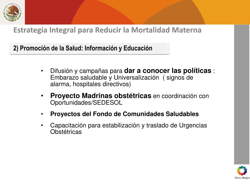 Estrategia Integral para Reducir la Mortalidad Materna 2) Promoción de la Salud: Información y Educación • Difusión y campañas para dar a conocer las políticas : Embarazo saludable y Universalización ( signos de alarma, hospitales directivos) • Proyecto Madrinas obstétricas en coordinación con Oportunidades/SEDESOL • Proyectos del Fondo de Comunidades Saludables • Capacitación para estabilización y traslado de Urgencias Obstétricas