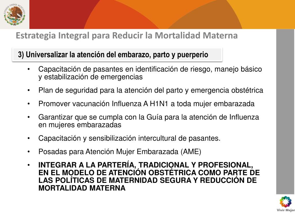 Estrategia Integral para Reducir la Mortalidad Materna 3) Universalizar la atención del embarazo, parto y puerperio • Capacitación de pasantes en identificación de riesgo, manejo básico y estabilización de emergencias • Plan de seguridad para la atención del parto y emergencia obstétrica • Promover vacunación Influenza A H1N1 a toda mujer embarazada • Garantizar que se cumpla con la Guía para la atención de Influenza en mujeres embarazadas • Capacitación y sensibilización intercultural de pasantes. • Posadas para Atención Mujer Embarazada (AME) • INTEGRAR A LA PARTERÍA, TRADICIONAL Y PROFESIONAL, EN EL MODELO DE ATENCIÓN OBSTÉTRICA COMO PARTE DE LAS POLÍTICAS DE MATERNIDAD SEGURA Y REDUCCIÓN DE MORTALIDAD MATERNA