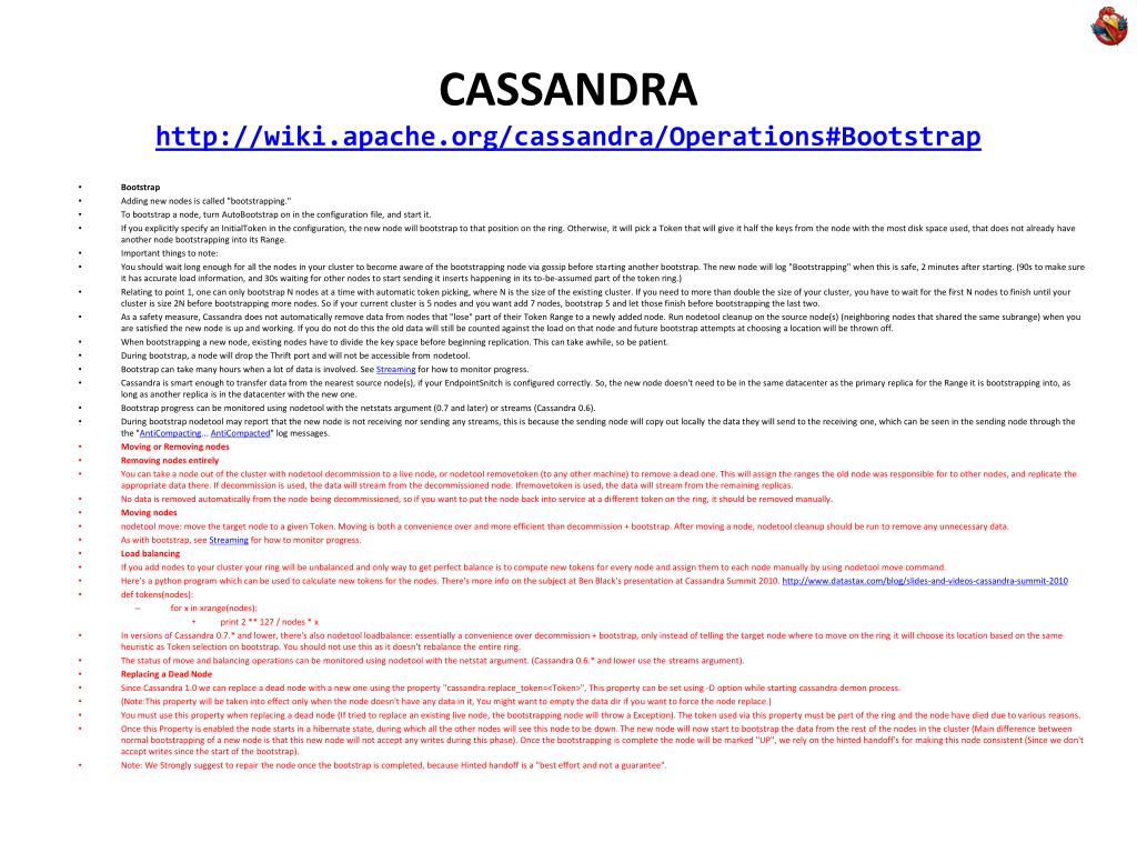 CASSANDRAhttp://wiki.apache.org/cassandra/Operations#BootstrapCASSANDRAhttp://wiki.apache.org/cassandra/Operations#Bootstrap • Bootstrap • Adding new nodes is called "bootstrapping." • To bootstrap a node, turn AutoBootstrap on in the configuration file, and start it. • If you explicitly specify an InitialToken in the configuration, the new node will bootstrap to that position on the ring. Otherwise, it will pick a Token that will give it half the keys from the node with the most disk space used, that does not already have another node bootstrapping into its Range. • Important things to note: • You should wait long enough for all the nodes in your cluster to become aware of the bootstrapping node via gossip before starting another bootstrap. The new node will log "Bootstrapping" when this is safe, 2 minutes after starting. (90s to make sure it has accurate load information, and 30s waiting for other nodes to start sending it inserts happening in its to-be-assumed part of the token ring.) • Relating to point 1, one can only bootstrap N nodes at a time with automatic token picking, where N is the size of the existing cluster. If you need to more than double the size of your cluster, you have to wait for the first N nodes to finish until your cluster is size 2N before bootstrapping more nodes. So if your current cluster is 5 nodes and you want add 7 nodes, bootstrap 5 and let those finish before bootstrapping the last two. • As a safety measure, Cassandra does not automatically remove data from nodes that "lose" part of their Token Range to a newly added node. Run nodetool cleanup on the source node(s) (neighboring nodes that shared the same subrange) when you are satisfied the new node is up and working. If you do not do this the old data will still be counted against the load on that node and future bootstrap attempts at choosing a location will be thrown off. • When bootstrapping a new node, existing nodes have to divide the key space before beginning replication. This can take awhile, so be patient. • During bootstrap, a node will drop the Thrift port and will not be accessible from nodetool. • Bootstrap can take many hours when a lot of data is involved. See Streaming for how to monitor progress. • Cassandra is smart enough to transfer data from the nearest source node(s), if your EndpointSnitch is configured correctly. So, the new node doesn't need to be in the same datacenter as the primary replica for the Range it is bootstrapping into, as long as another replica is in the datacenter with the new one. • Bootstrap progress can be monitored using nodetool with the netstats argument (0.7 and later) or streams (Cassandra 0.6). • During bootstrap nodetool may report that the new node is not receiving nor sending any streams, this is because the sending node will copy out locally the data they will send to the receiving one, which can be seen in the sending node through the the "AntiCompacting... AntiCompacted" log messages. • Moving or Removing nodes • Removing nodes entirely • You can take a node out of the cluster with nodetool decommission to a live node, or nodetoolremovetoken (to any other machine) to remove a dead one. This will assign the ranges the old node was responsible for to other nodes, and replicate the appropriate data there. If decommission is used, the data will stream from the decommissioned node. Ifremovetoken is used, the data will stream from the remaining replicas. • No data is removed automatically from the node being decommissioned, so if you want to put the node back into service at a different token on the ring, it should be removed manually. • Moving nodes • nodetool move: move the target node to a given Token. Moving is both a convenience over and more efficient than decommission + bootstrap. After moving a node, nodetool cleanup should be run to remove any unnecessary data. • As with bootstrap, see Streaming for how to monitor progress. • Load balancing • If you add nodes to your cluster your ring will be unbalanced and only way to get perfect balance is to compute new tokens for every node and assign them to each node manually by using nodetool move command. • Here's a python program which can be used to calculate new tokens for the nodes. There's more info on the subject at Ben Black's presentation at Cassandra Summit 2010. http://www.datastax.com/blog/slides-and-videos-cassandra-summit-2010 • def tokens(nodes): • for x in xrange(nodes): • print 2 ** 127 / nodes * x • In versions of Cassandra 0.7.* and lower, there's also nodetoolloadbalance: essentially a convenience over decommission + bootstrap, only instead of telling the target node where to move on the ring it will choose its location based on the same heuristic as Token selection on bootstrap. You should not use this as it doesn't rebalance the entire ring. • The status of move and balancing operations can be monitored using nodetool with the netstat argument. (Cassandra 0.6.* and lower use the streams argument). • Replacing a Dead Node • Since Cassandra 1.0 we can replace a dead node with a new one using the property "cassandra.replace_token=<Token>", This property can be set using -D option while starting cassandra demon process. • (Note:This property will be taken into effect only when the node doesn't have any data in it, You might want to empty the data dir if you want to force the node replace.) • You must use this property when replacing a dead node (If tried to replace an existing live node, the bootstrapping node will throw a Exception). The token used via this property must be part of the ring and the node have died due to various reasons. • Once this Property is enabled the node starts in a hibernate state, during which all the other nodes will see this node to be down. The new node will now start to bootstrap the data from the rest of the nodes in the cluster (Main difference between normal bootstrapping of a new node is