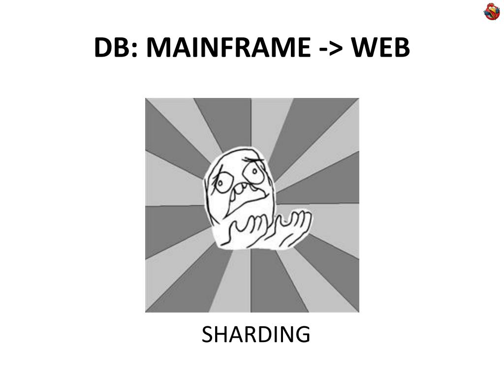DB: MAINFRAME-> WEB • MySql • Replica (v 3.23.15, 2000) • memcached (2003) • batch insert/queue (mainframe`s) • c/java daemon (custom binary file format) • sharding (vertical/horizontal) + hand-made sharding framework
