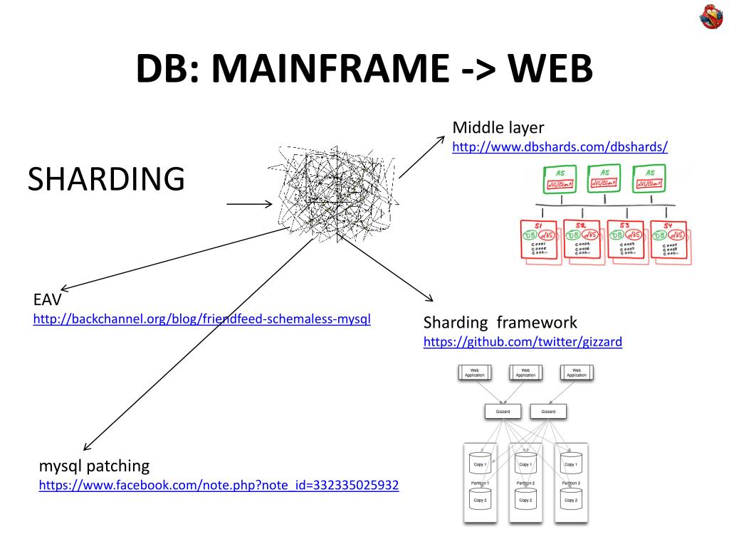 DB: MAINFRAME-> WEB Middle layerhttp://www.dbshards.com/dbshards/ SHARDING EAV http://backchannel.org/blog/friendfeed-schemaless-mysql Sharding frameworkhttps://github.com/twitter/gizzard mysql patchinghttps://www.facebook.com/note.php?note_id=332335025932