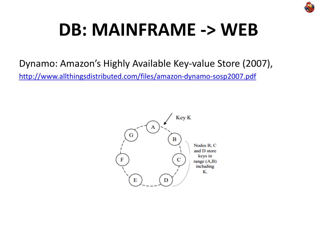 DB: MAINFRAME-> WEB • Dynamo: Amazon’s Highly Available Key-value Store (2007), • http://www.allthingsdistributed.com/files/amazon-dynamo-sosp2007.pdf
