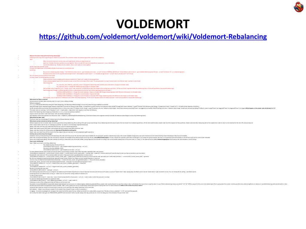 VOLDEMORThttps://github.com/voldemort/voldemort/wiki/Voldemort-RebalancingVOLDEMORThttps://github.com/voldemort/voldemort/wiki/Voldemort-Rebalancing • What are the actual steps performed during rebalancing? • Following are the steps that we go through to rebalance successfully. The controller initiates the rebalancing and then waits for the completion. • Input • Either (a) current cluster xml, current stores xml, target cluster xml (b) url, target cluster xml • batch size – Number of primary partitions to move together. There is a trade-off, more primary partitions movements = more redirections. • max parallel rebalancing – Number of units ( stealer + donor node tuples ) to move together • Get the latest state from the clusterCompare the targetCluster.xml provided and add all new nodes to currentCluster.xml • Verify that • We are not in rebalancing state already ( “./bin/voldemort-admin-tool.sh —get-metadata server.state —url [url]” all returns NORMAL_SERVER and “./bin/voldemort-admin-tool.sh —get-metadata rebalancing.steal.info.key —url [url]” all returns “[]” i.e. no rebalancing state ) • RO stores ( if they exist ) are all using the latest storage format ( “./bin/voldemort-admin-tool.sh —ro-metadata storage-format —url [url]” returns all stores with “ro2” format ) • Get a list of every primary partition to be moved • For every “batch” of primary partitions to move • Create a transition cluster metadata which contains movement of “batch size” number of primary partitions • Create a rebalancing plan based on this transition cluster.xml and the current state of the cluster. The plan generated is a map of stealer node to list of donor node + partitions to be moved. • State change step • has_read-only_stores AND has_read-write_stores => Change the rebalancing state [ with RO stores information ] change on all stealer nodes • has_read-only_stores => Change the rebalancing state change on all stealer nodes • Start multiple units of migration [ unit => stealer + donor node movement ] of all RO Stores data [ No changes to the routing layer and clients ]. At the end of each migration delete the rebalancing state => Done with parallelism ( max parallel rebalancing ) • State change step [ Changes in rebalancing state will kick in redirecting stores which will start redirecting requests to the old nodes ] • hasROStore AND hasRWStore => Change the cluster metadata + Swap on all nodes AND Change rebalancing state [ with RW stores information ] on all stealer nodes • hasROStore AND !hasRWStore => Change the cluster metadata + Swap on all nodes • !hasROStore AND hasRWStore => Change the cluster metadata on all nodes AND Change rebalancing state [ with RW stores information ] on all stealer nodes • Start multiple units of migration of all RW Stores data [ With redirecting happening ]. At the end of migration delete the rebalancing state => Done with parallelism ( max parallel rebalancing ) • What about the failure scenarios? • Extra precaution has been taken and every step ( 5 [ c,d,e,f ] ) has a rollback strategy • Rollback strategy for5 ( c , e ) => If any failure takes place during the ‘State change step’, the following rollback strategy is run on every node that was completed successfully • Swap ROChange cluster metadataChange rebalance stateOrderFTTremove the rebalance state change → change back clusterFFTremove from rebalance state changeTTFchange back cluster metadata → swapTTTremove from rebalance state change → change back cluster → swap5 ( d, f ) => Similarly during migration of partitions • Has RO storesHas RW storesFinished RO storesRollback Action [ in the correct order ]TTTrollback cluster change + swapTTFnothing to do since “rebalance state change” should have removed everythingTFTwon’t be triggered since hasRW is falseTFFnothing to do since “rebalance state change” should have removed everythingFTTrollback cluster changeFTFwon’t be triggeredFFTwon’t be triggeredFFFwon’t be triggeredWhat happens on the stealer node side during 5 ( d, f )? • The stealer node on receiving a “unit of migration” [ unit => single stealer + single donor node migration ] and does the following • Check if the rebalancing state change was already done [ i.e. 5 ( c, e ) was successfully completed ] • Acquire a lock for the donor node [ Fail if donor node was already rebalancing ] • Start migration of the store partitions from the donor node => PARALLEL [ setMaxParallelStoresRebalancing ]. At the end of every store migration remove it from the list rebalance state change [ so as to stop redirecting stores ] • What about the donor side? • The donor node has no knowledge for rebalancing at all and keeps behaving normally. • What about my data consistency during rebalancing? • Rebalancing process has to maintain data consistency guarantees during rebalancing, We are doing it through a proxy based design. Once rebalancing starts the stealer node is the new master for all rebalancing partitions, All the clients talk directly to stealer node for all the requests for these partitions. Stealer node internally make proxy calls to the original donor node to return correct data back to the client.The process steps are • Client request stealer node for key ‘k1’ belonging to partition ‘p1’ which is currently being migrated/rebalanced. • Stealer node looks at the key and understands that this key is part of a rebalancing partition • Stealer node makes a proxy call to donor node and gets the list of values as returned by the donor node. • Stealer node does local put for all (key,value) pairs ignoring all ObsoleteVersionException • Stealer node now should have all the versions from the original node and now does normal local get/put/ getAll operations. • And how do my clients know the changes? • Voldemort client currently bootstrap from the bootstrap URL at the st