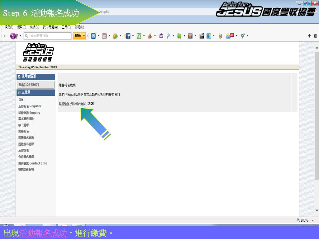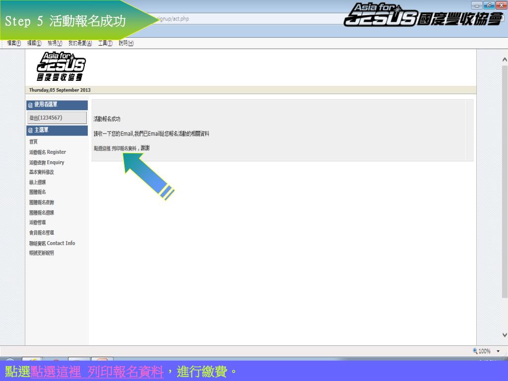 Step5 活動報名成功 點選點選這裡 列印報名資料,進行繳費。