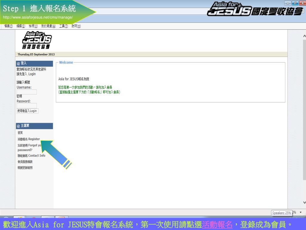 Step1 進入報名系統 http://www.asiaforjesus.net/cms/manage/ 歡迎進入Asia for JESUS特會報名系統,第一次使用請點選活動報名,登錄成為會員。