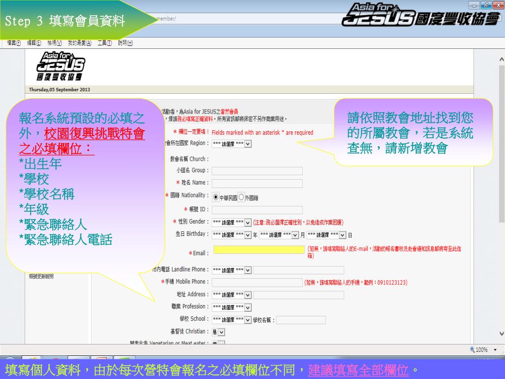 Step3 填寫會員資料 請依照教會地址找到您的所屬教會,若是系統查無,請新增教會 報名系統預設的必填之外,校園復興挑戰特會之必填欄位: *出生年 *學校 *學校名稱 *年級 *緊急聯絡人 *緊急聯絡人電話 填寫個人資料,由於每次營特會報名之必填欄位不同,建議填寫全部欄位。