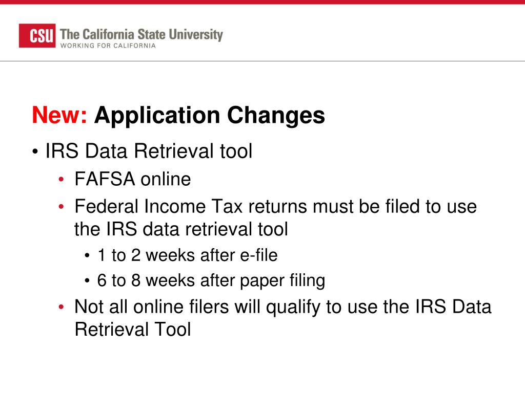 New: Application Changes • IRS Data Retrieval tool • FAFSA online • Federal Income Tax returns must be filed to use the IRS data retrieval tool • 1 to 2 weeks after e-file • 6 to 8 weeks after paper filing • Not all online filers will qualify to use the IRS Data Retrieval Tool