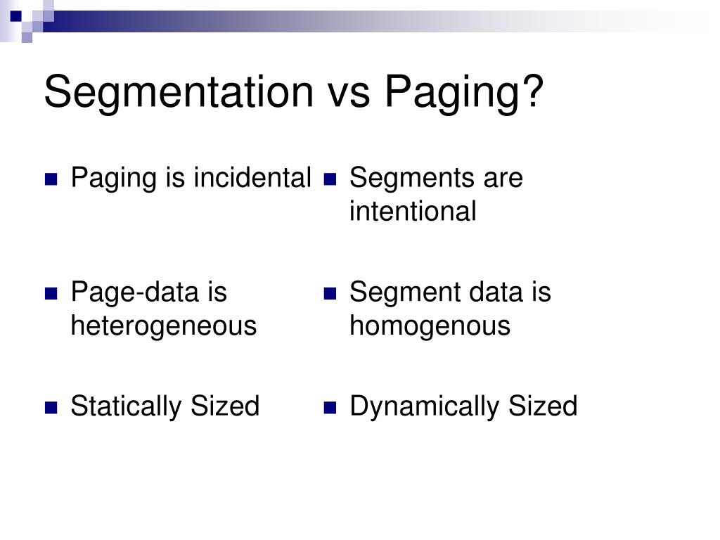 Paging is incidental Page-data is heterogeneous Statically Sized Segments are intentional Segment data is homogenous Dynamically Sized Segmentation vs Paging?