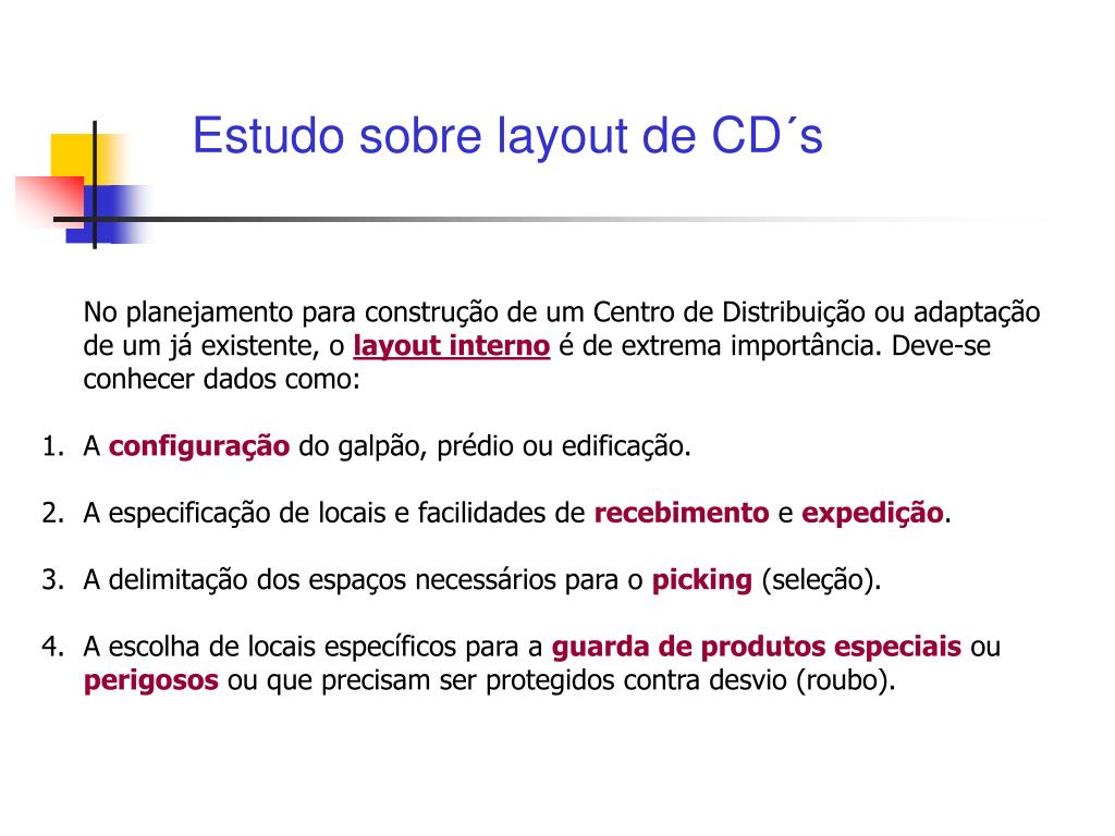 Estudo sobre layout de CD´s. No planejamento para construção de um Centro de Distribuição ou adaptação de um já existente, o layout interno é de extrema importância. Deve-se conhecer dados como: A configuração do galpão, prédio ou edificação.