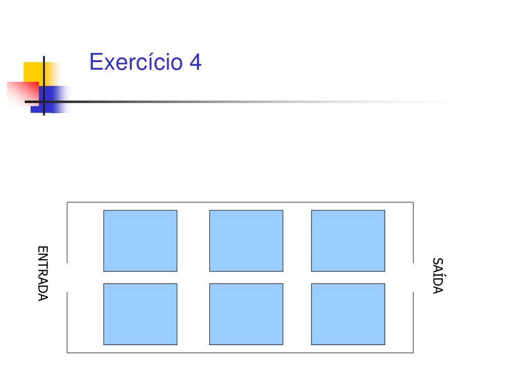 Exercício 4 Considere que um armazém de um Centro de Distribuição possui 6 áreas de armazenagem. Os produtos entram pelos fundos do mesmo (ENTRADA) e são retirados do local de armazenagem e transportados até à plataforma de carregamento (SAÍDA). Tome o desenho abaixo como referência. Cada uma das baias de armazenagem tem a capacidade de estocar 660 m3. Ali são armazenados 10 produtos diferentes e os dados relativos estão na tabela seguinte. A C E ENTRADA SAÍDA B D F