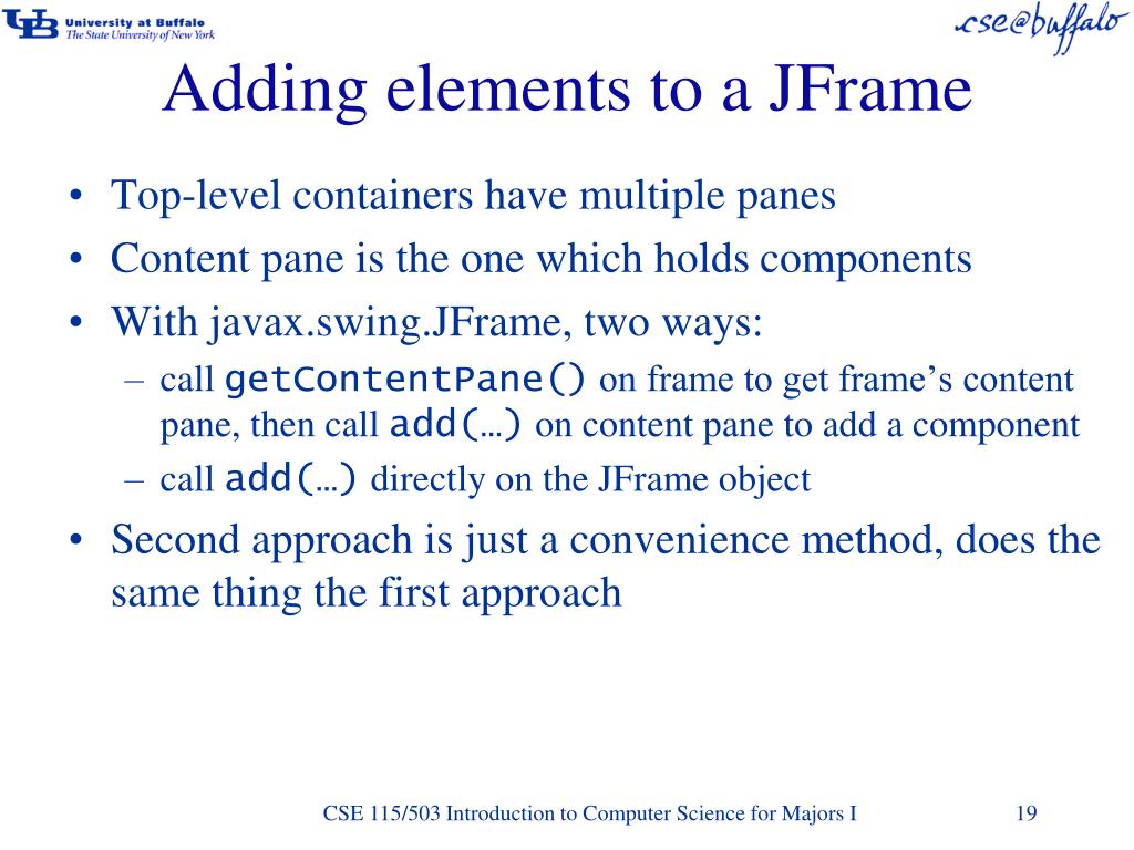Adding elements to a JFrame • Top-level containers have multiple panes • Content pane is the one which holds components • With javax.swing.JFrame, two ways: • call getContentPane() on frame to get frame’s content pane, then call add(…) on content pane to add a component • call add(…) directly on the JFrame object • Second approach is just a convenience method, does the same thing the first approach CSE 115/503 Introduction to Computer Science for Majors I