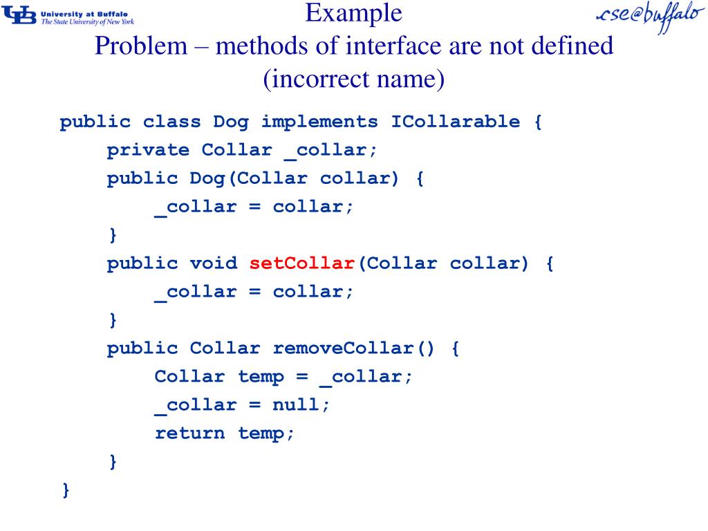 ExampleProblem – methods of interface are not defined (incorrect name) public class Dog implements ICollarable { private Collar _collar; public Dog(Collar collar) { _collar = collar; } public void setCollar(Collar collar) { _collar = collar; } public Collar removeCollar() { Collar temp = _collar; _collar = null; return temp; } }