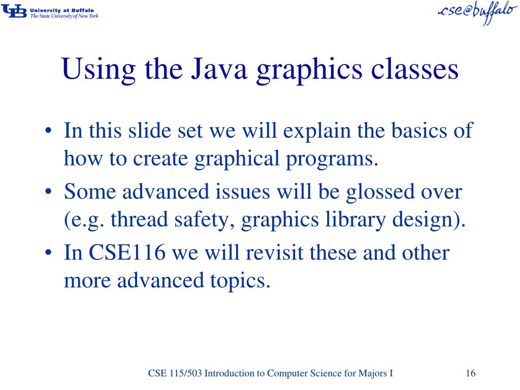 Using the Java graphics classes • In this slide set we will explain the basics of how to create graphical programs. • Some advanced issues will be glossed over (e.g. thread safety, graphics library design). • In CSE116 we will revisit these and other more advanced topics. CSE 115/503 Introduction to Computer Science for Majors I