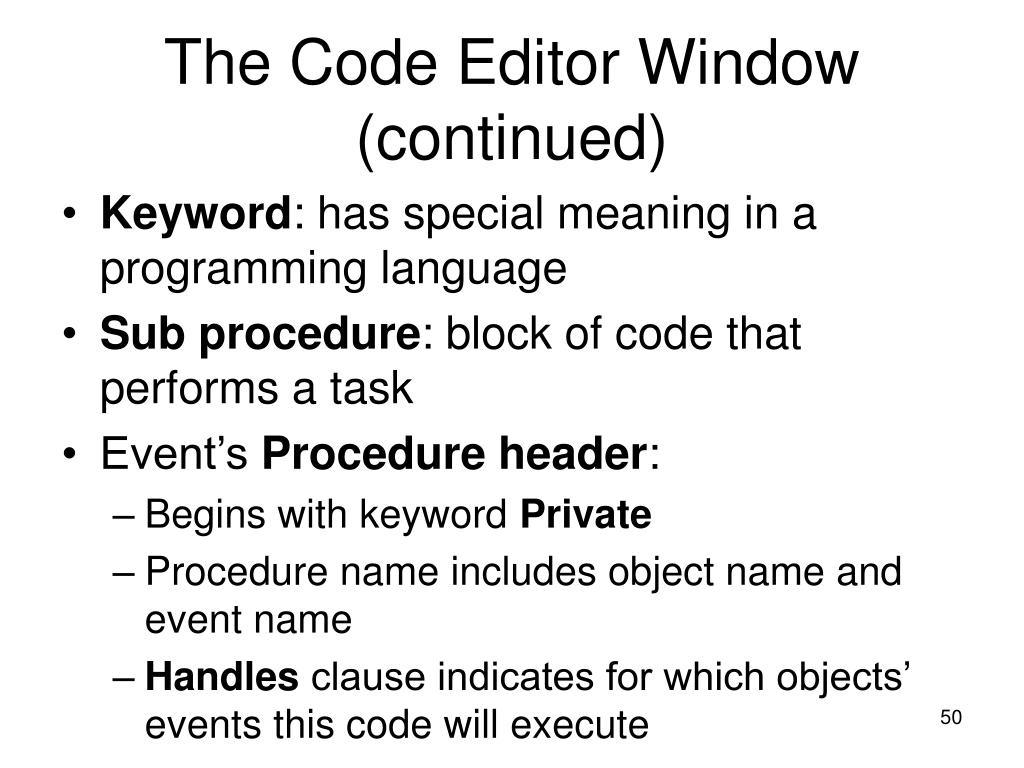 The Code Editor Window (continued) • Keyword: has special meaning in a programming language • Sub procedure: block of code that performs a task • Event’s Procedure header: • Begins with keyword Private • Procedure name includes object name and event name • Handles clause indicates for which objects’ events this code will execute