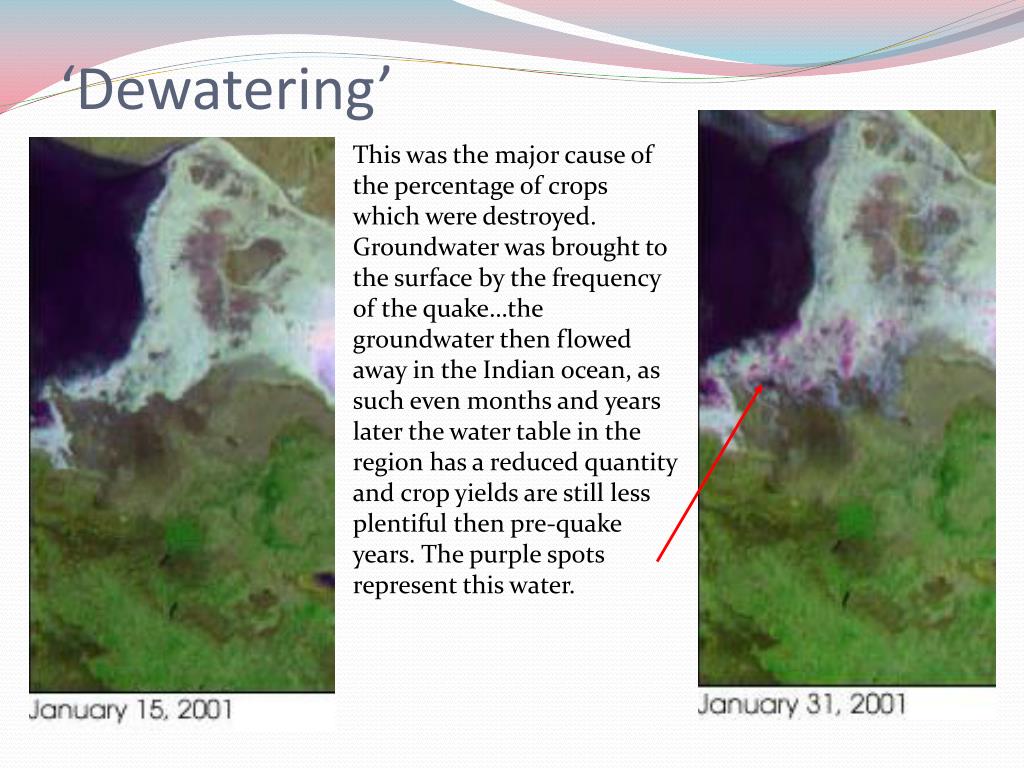 ‘Dewatering’ This was the major cause of the percentage of crops which were destroyed. Groundwater was brought to the surface by the frequency of the quake…the groundwater then flowed away in the Indian ocean, as such even months and years later the water table in the region has a reduced quantity and crop yields are still less plentiful then pre-quake years. The purple spots represent this water.