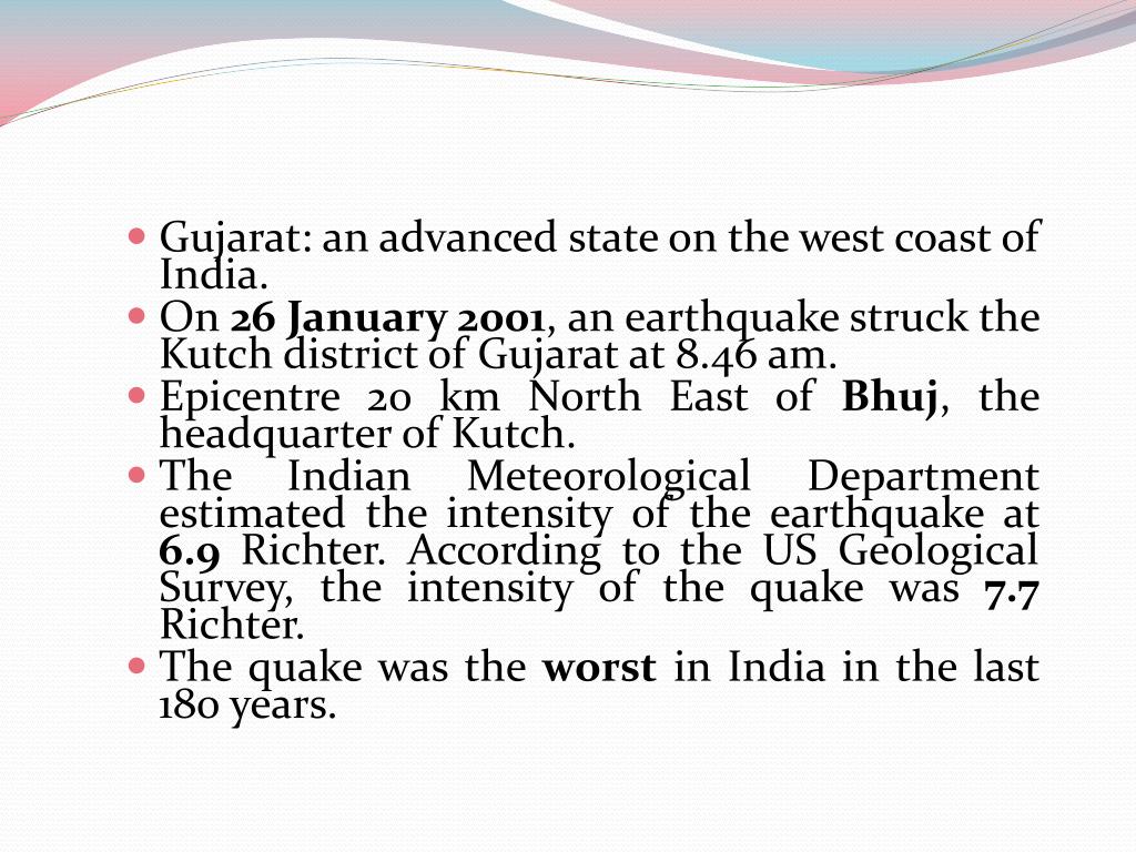 Gujarat: an advanced state on the west coast of India. • On 26 January 2001, an earthquake struck the Kutch district of Gujarat at 8.46 am. • Epicentre 20 km North East of Bhuj, the headquarter of Kutch. • The Indian Meteorological Department estimated the intensity of the earthquake at 6.9 Richter. According to the US Geological Survey, the intensity of the quake was 7.7 Richter. • The quake was the worst in India in the last 180 years.