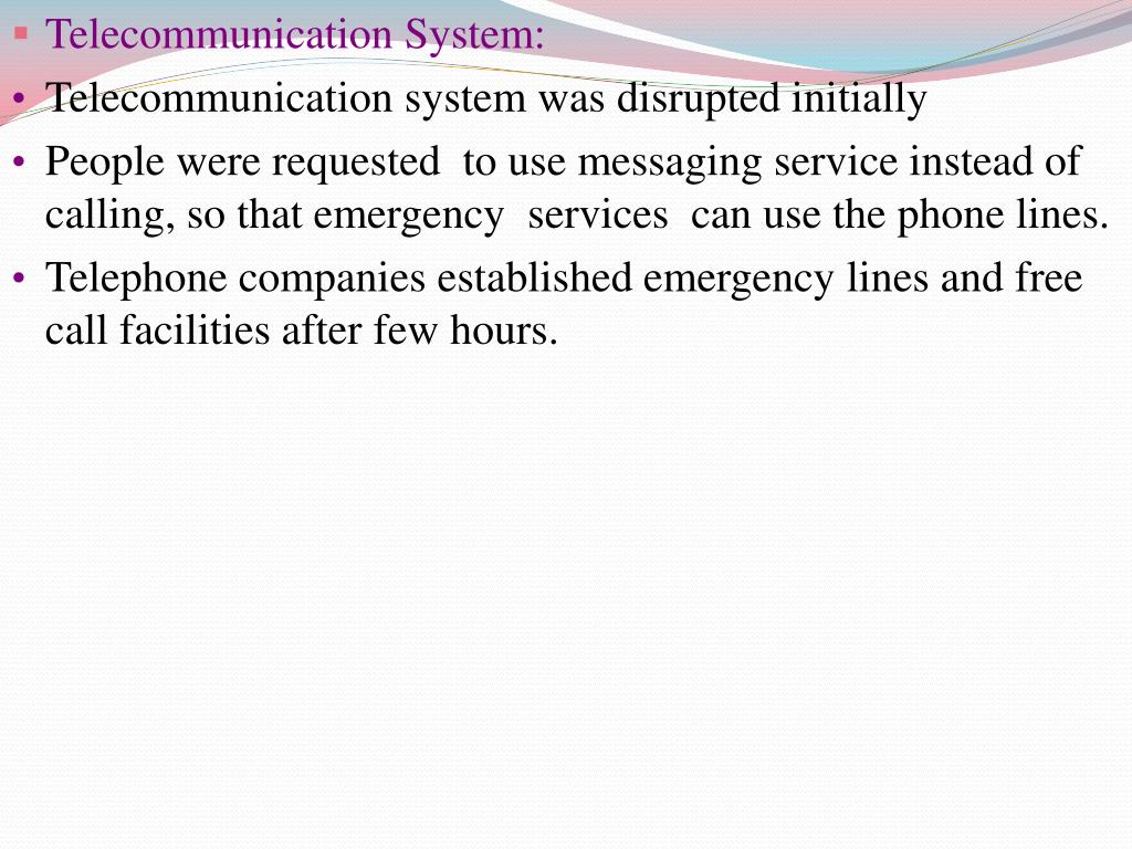 Telecommunication System: • Telecommunication system was disrupted initially • People were requested to use messaging service instead of calling, so that emergency services can use the phone lines. • Telephone companies established emergency lines and free call facilities after few hours.