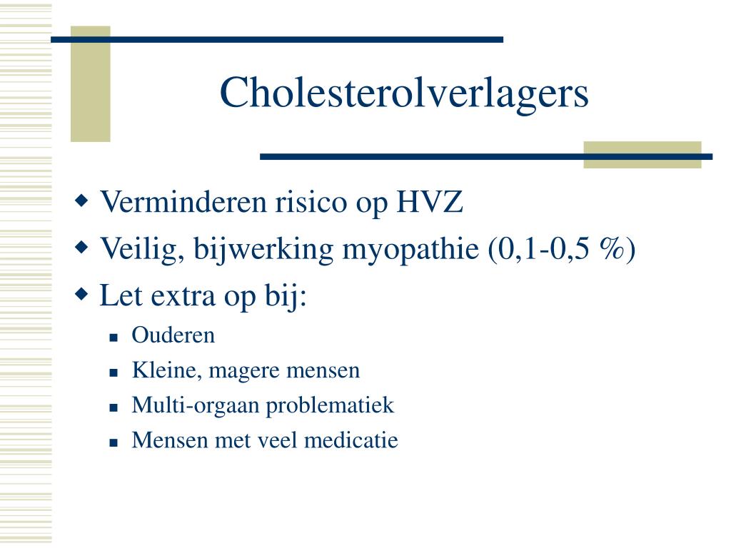 Cholesterolverlagers • Verminderen risico op HVZ • Veilig, bijwerking myopathie (0,1-0,5 %) • Let extra op bij: • Ouderen • Kleine, magere mensen • Multi-orgaan problematiek • Mensen met veel medicatie