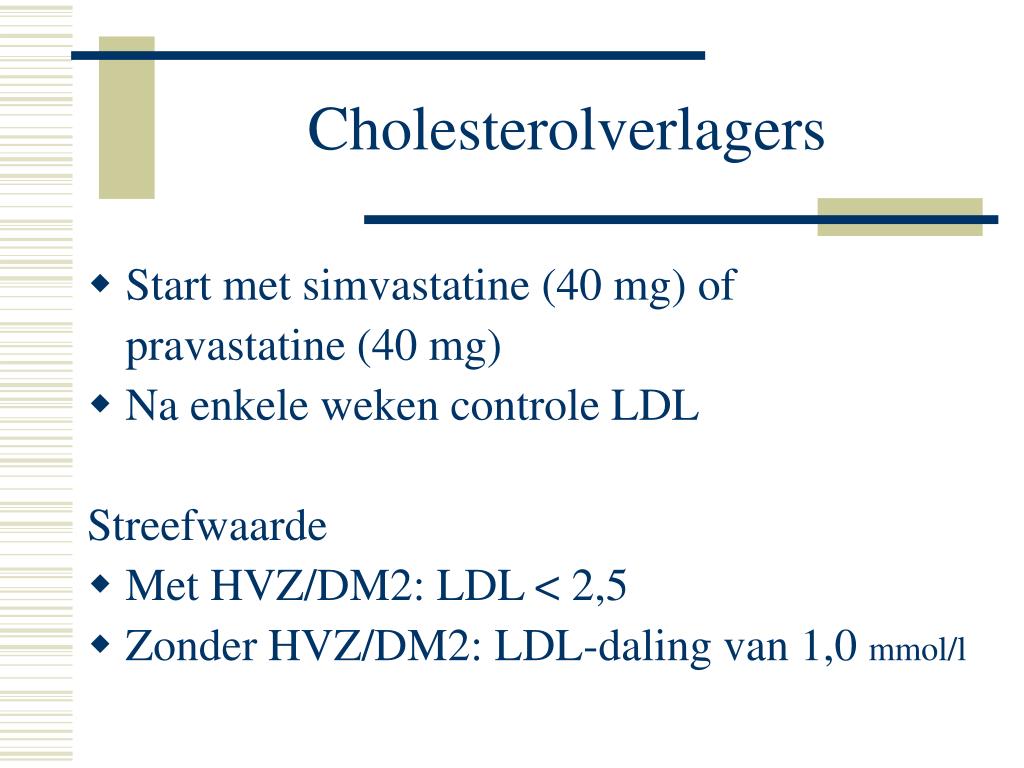 Cholesterolverlagers • Start met simvastatine (40 mg) of pravastatine (40 mg) • Na enkele weken controle LDL Streefwaarde • Met HVZ/DM2: LDL < 2,5 • Zonder HVZ/DM2: LDL-daling van 1,0 mmol/l