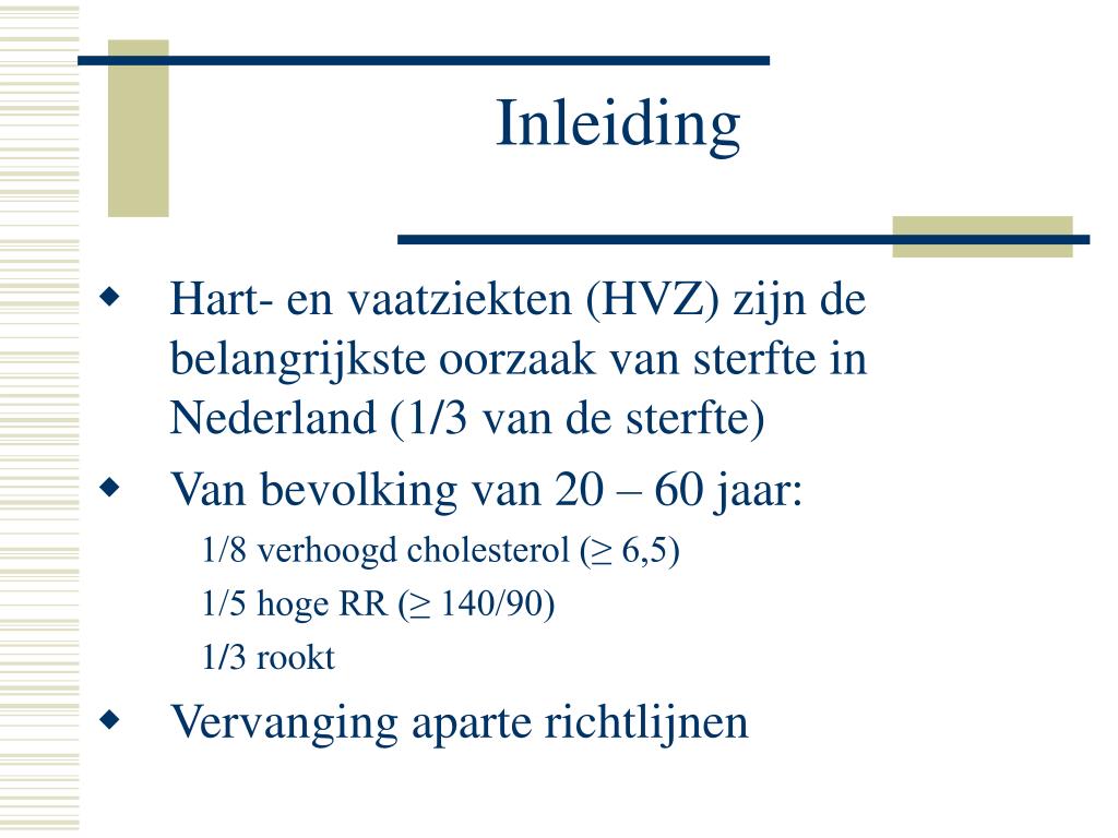 Inleiding • Hart- en vaatziekten (HVZ) zijn de belangrijkste oorzaak van sterfte in Nederland (1/3 van de sterfte) • Van bevolking van 20 – 60 jaar: 1/8 verhoogd cholesterol (≥ 6,5) 1/5 hoge RR (≥ 140/90) 1/3 rookt • Vervanging aparte richtlijnen