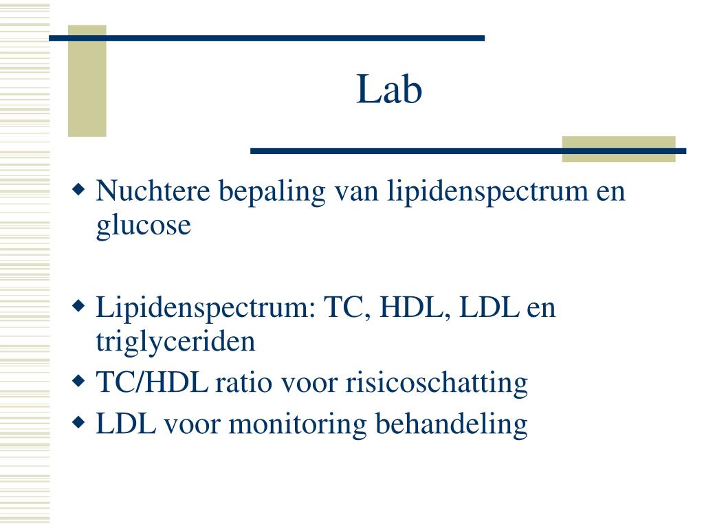 Lab • Nuchtere bepaling van lipidenspectrum en glucose • Lipidenspectrum: TC, HDL, LDL en triglyceriden • TC/HDL ratio voor risicoschatting • LDL voor monitoring behandeling