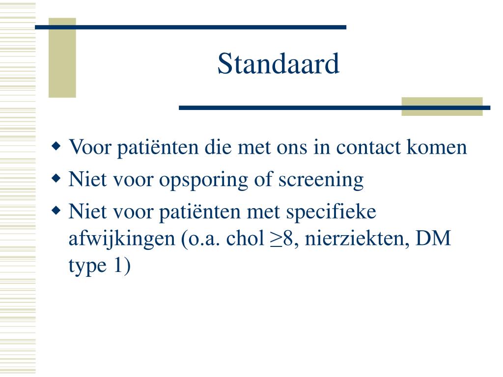 Standaard • Voor patiënten die met ons in contact komen • Niet voor opsporing of screening • Niet voor patiënten met specifieke afwijkingen (o.a. chol ≥8, nierziekten, DM type 1)