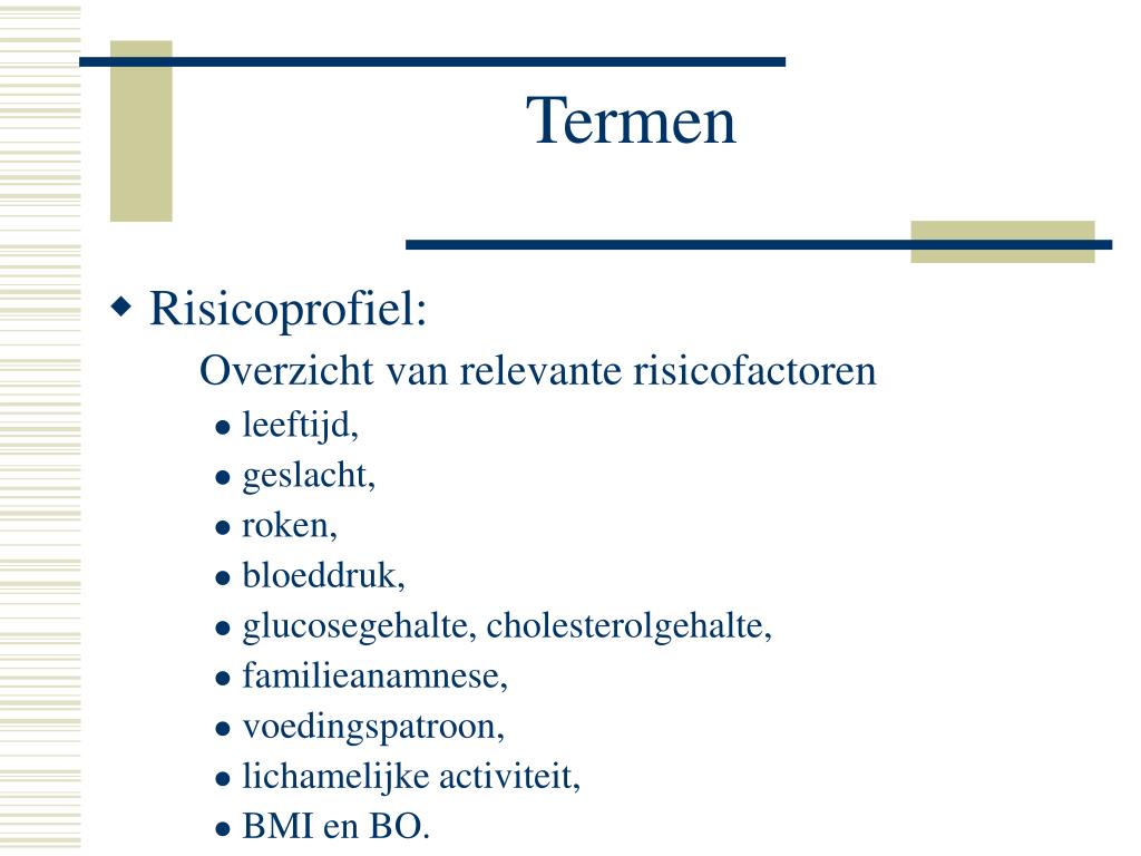 Termen • Risicoprofiel: Overzicht van relevante risicofactoren • leeftijd, • geslacht, • roken, • bloeddruk, • glucosegehalte, cholesterolgehalte, • familieanamnese, • voedingspatroon, • lichamelijke activiteit, • BMI en BO.