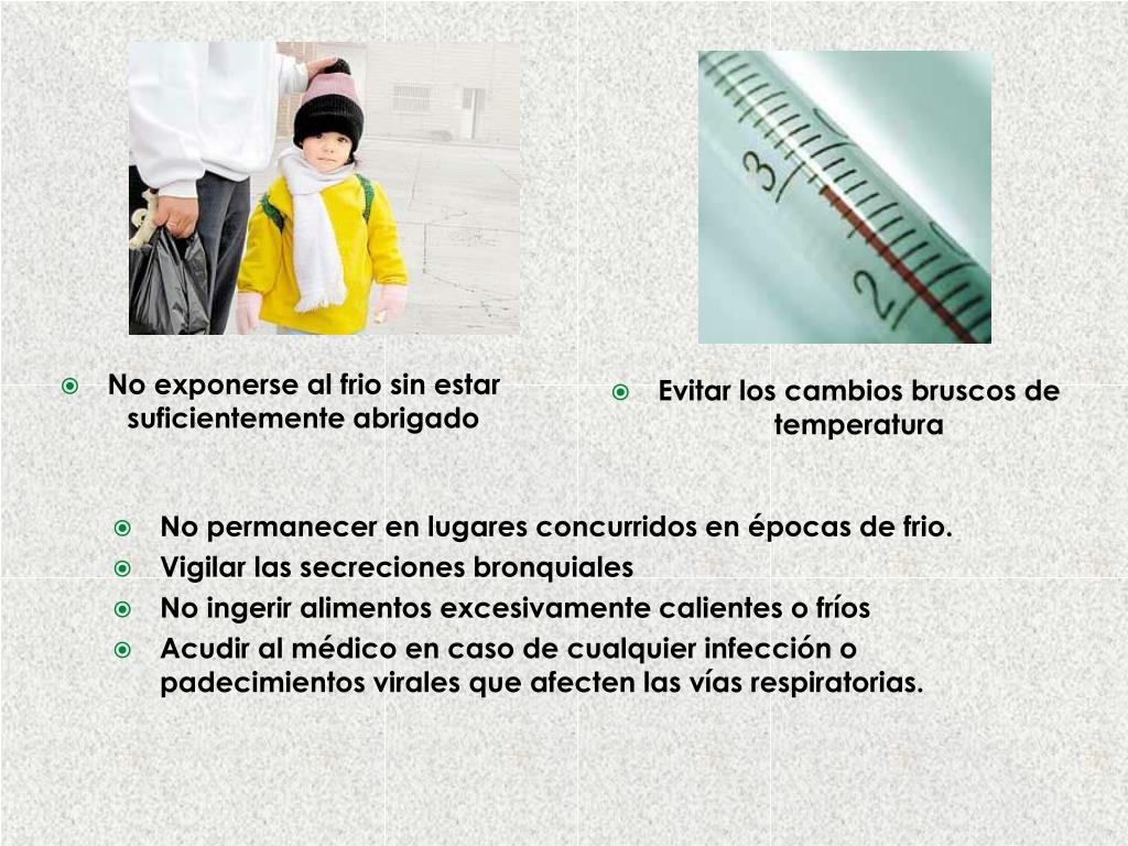 No exponerse al frio sin estar suficientemente abrigado • Evitar los cambios bruscos de temperatura • No permanecer en lugares concurridos en épocas de frio. • Vigilar las secreciones bronquiales • No ingerir alimentos excesivamente calientes o fríos • Acudir al médico en caso de cualquier infección o padecimientos virales que afecten las vías respiratorias.
