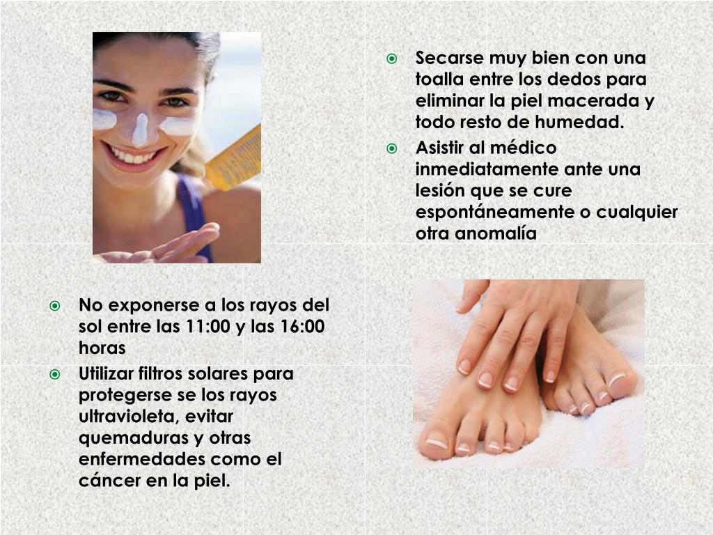 No exponerse a los rayos del sol entre las 11:00 y las 16:00 horas • Utilizar filtros solares para protegerse se los rayos ultravioleta, evitar quemaduras y otras enfermedades como el cáncer en la piel. • Secarse muy bien con una toalla entre los dedos para eliminar la piel macerada y todo resto de humedad. • Asistir al médico inmediatamente ante una lesión que se cure espontáneamente o cualquier otra anomalía