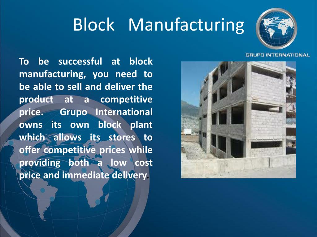 Block Manufacturing To be successful at block manufacturing, you need to be able to sell and deliver the product at a competitive price. Grupo International owns its own block plant which allows its stores to offer competitive prices while providing both a low cost price and immediate delivery.