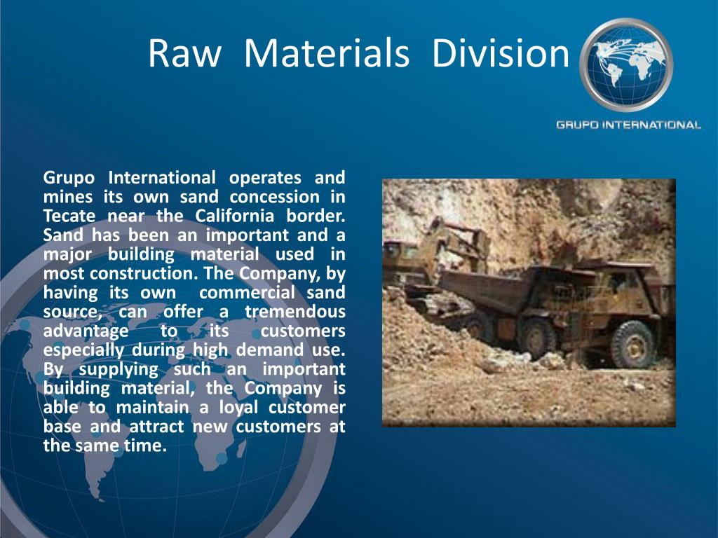Raw Materials Division Grupo International operates and mines its own sand concession in Tecate near the California border. Sand has been an important and a major building material used in most construction. The Company, by having its own commercial sand source, can offer a tremendous advantage to its customers especially during high demand use. By supplying such an important building material, the Company is able to maintain a loyal customer base and attract new customers at the same time.