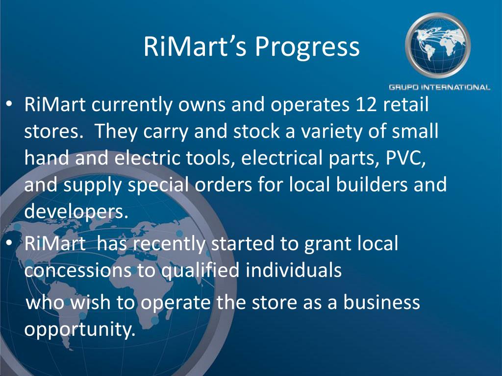 RiMart’s Advantages ● Size: Small, but efficient stores that can offer the consumer a wide range of savings. ● Opportunity: Ease of an entry level business in cost and locations.● Association: Grupo International can assist at every level of its business structure in its stores and concessions.