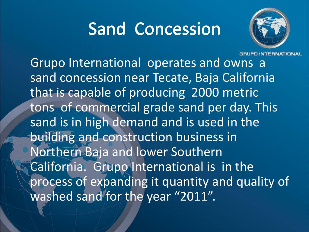 Sand Concession Sand Concession Grupo International operates and owns a sand concession near Tecate, Baja California that is capable of producing 2000 metric tons of commercial grade sand per day. This sand is in high demand and is used in the building and construction business in Northern Baja and lower Southern California. Grupo International is in the process of expanding it quantity and quality of washed sand for the year “2011”.