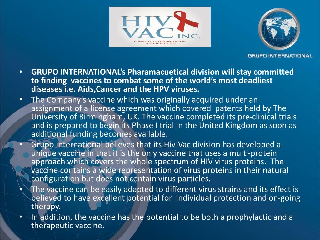 GRUPO INTERNATIONAL’s Pharamacuetical division will stay committed to finding vaccines to combat some of the world’s most deadliest diseases i.e. Aids,Cancer and the HPV viruses. • The Company’s vaccine which was originally acquired under an assignment of a license agreement which covered patents held by The University of Birmingham, UK. The vaccine completed its pre-clinical trials and is prepared to begin its Phase I trial in the United Kingdom as soon as additional funding becomes available. • Grupo International believes that its Hiv-Vac division has developed a unique vaccine in that it is the only vaccine that uses a multi-protein approach which covers the whole spectrum of HIV virus proteins. The vaccine contains a wide representation of virus proteins in their natural configuration but does not contain virus particles. • The vaccine can be easily adapted to different virus strains and its effect is believed to have excellent potential for individual protection and on-going therapy. • In addition, the vaccine has the potential to be both a prophylactic and a therapeutic vaccine.