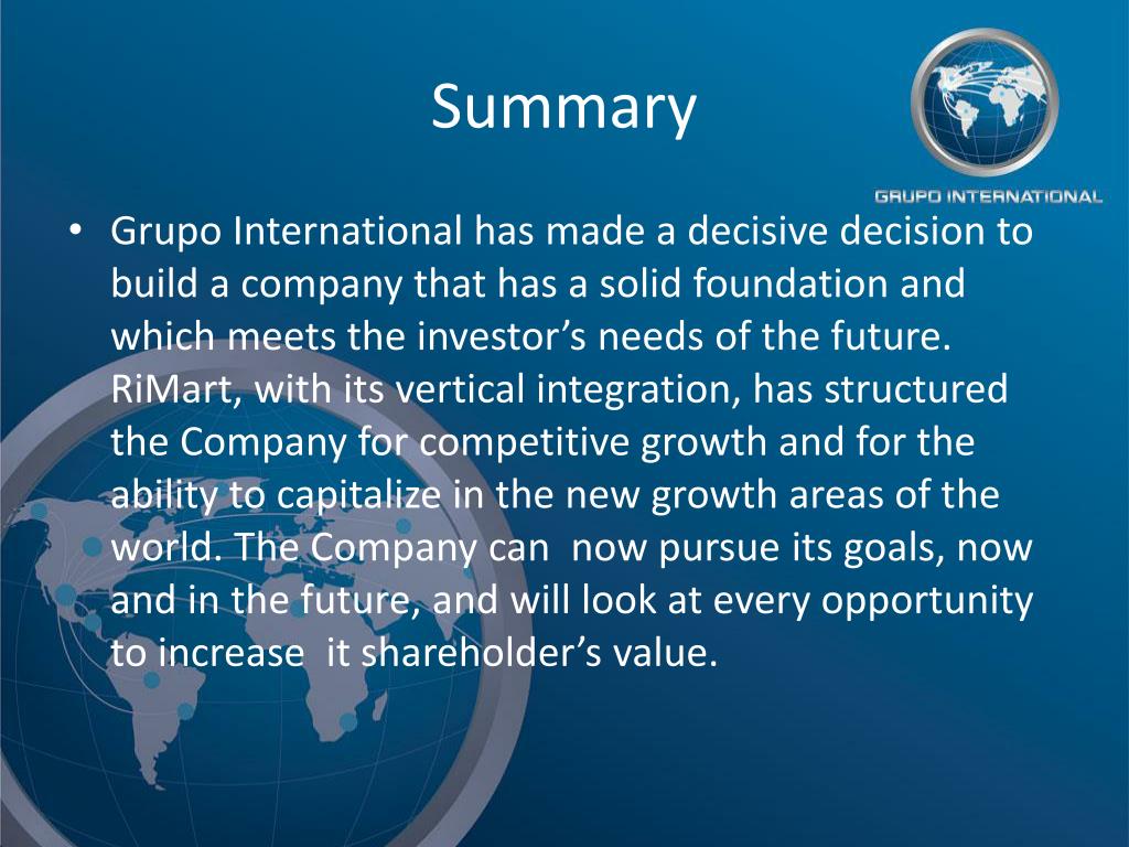 Summary • Grupo International has made a decisive decision to build a company that has a solid foundation and which meets the investor’s needs of the future. RiMart, with its vertical integration, has structured the Company for competitive growth and for the ability to capitalize in the new growth areas of the world. The Company can now pursue its goals, now and in the future, and will look at every opportunity to increase it shareholder’s value.