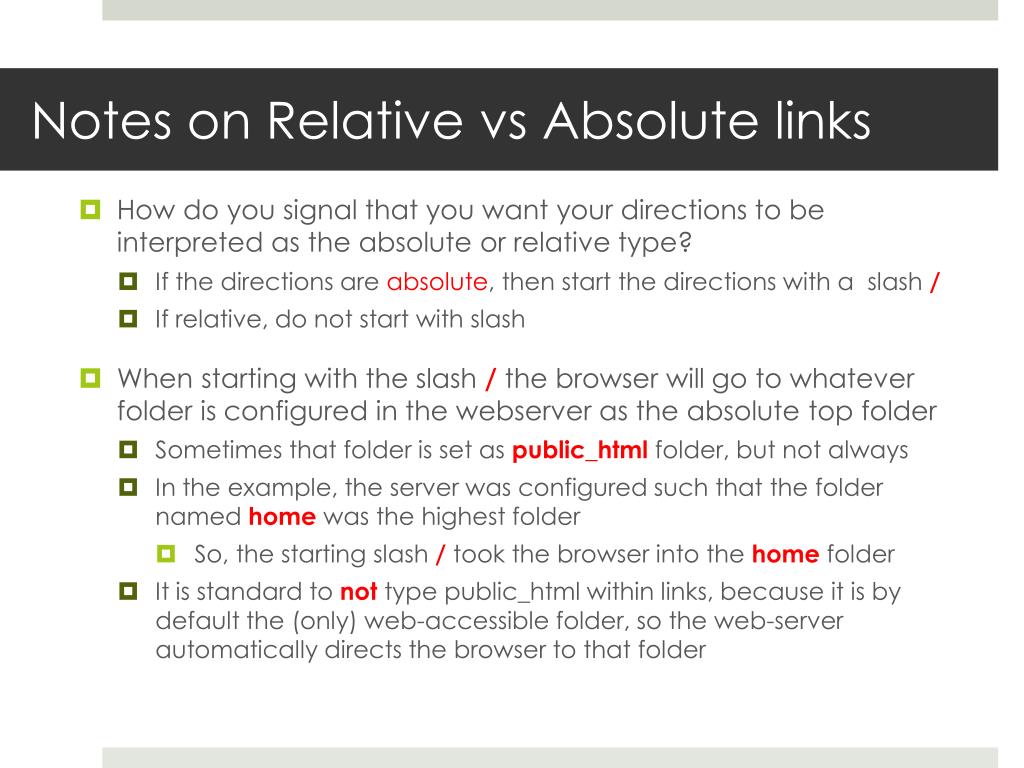 Notes on Relative vs Absolute links • How do you signal that you want your directions to be interpreted as the absolute or relative type? • If the directions are absolute, then start the directions with a slash / • If relative, do not start with slash • When starting with the slash / the browser will go to whatever folder is configured in the webserver as the absolute top folder • Sometimes that folder is set as public_html folder, but not always • In the example, the server was configured such that the folder named homewas the highest folder • So, the starting slash / took the browser into the homefolder • It is standard to nottype public_html within links, because it is by default the (only) web-accessible folder, so the web-server automatically directs the browser to that folder
