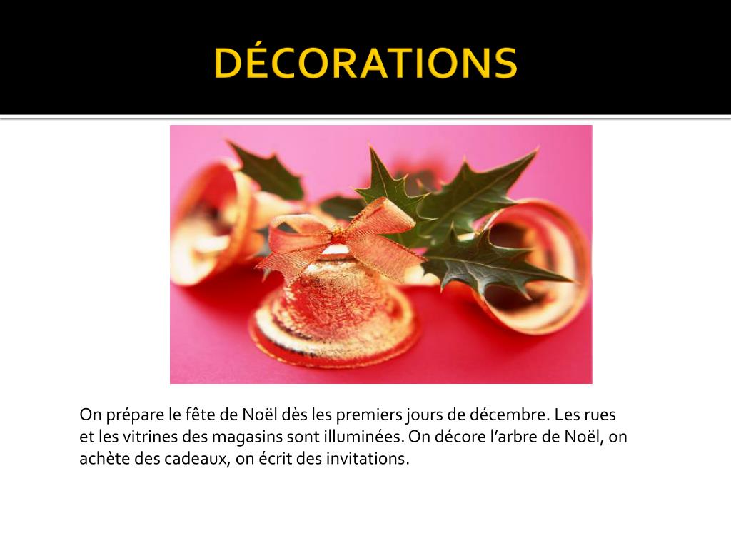 On prépare le fête de Noël dès les premiers jours de décembre. Les rues et les vitrines des magasins sont illuminées. On décore l’arbre de Noël, on achète des cadeaux, on écrit des invitations.