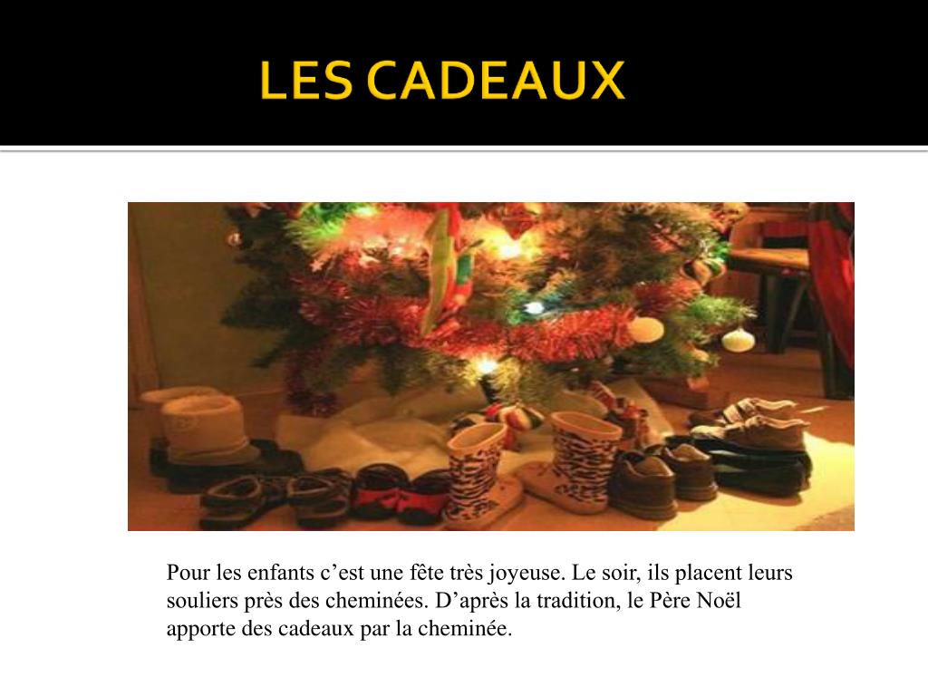 Pour les enfants c’est une fête très joyeuse. Le soir, ils placent leurs souliers près des cheminées. D’après la tradition, le Père Noël apporte des cadeaux par la cheminée.