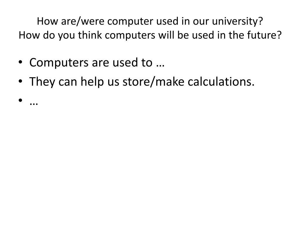 How are/were computer used in our university?How do you think computers will be used in the future? • Computers are used to … • They can help us store/make calculations. • …